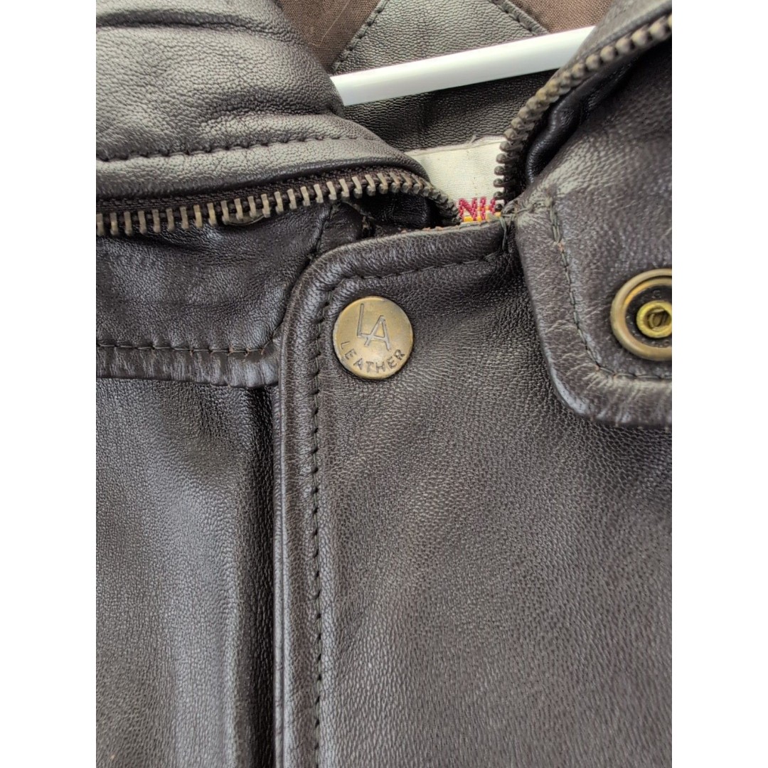 California LA Leather bomber style jacket. Mens size Medium in brown. Features 2 interior pockets and 4 outside pockets with 2 layers of closures. there are some super tiny white spots which are pictured near the right armpit, very, very small, see pictures for measurements and condition