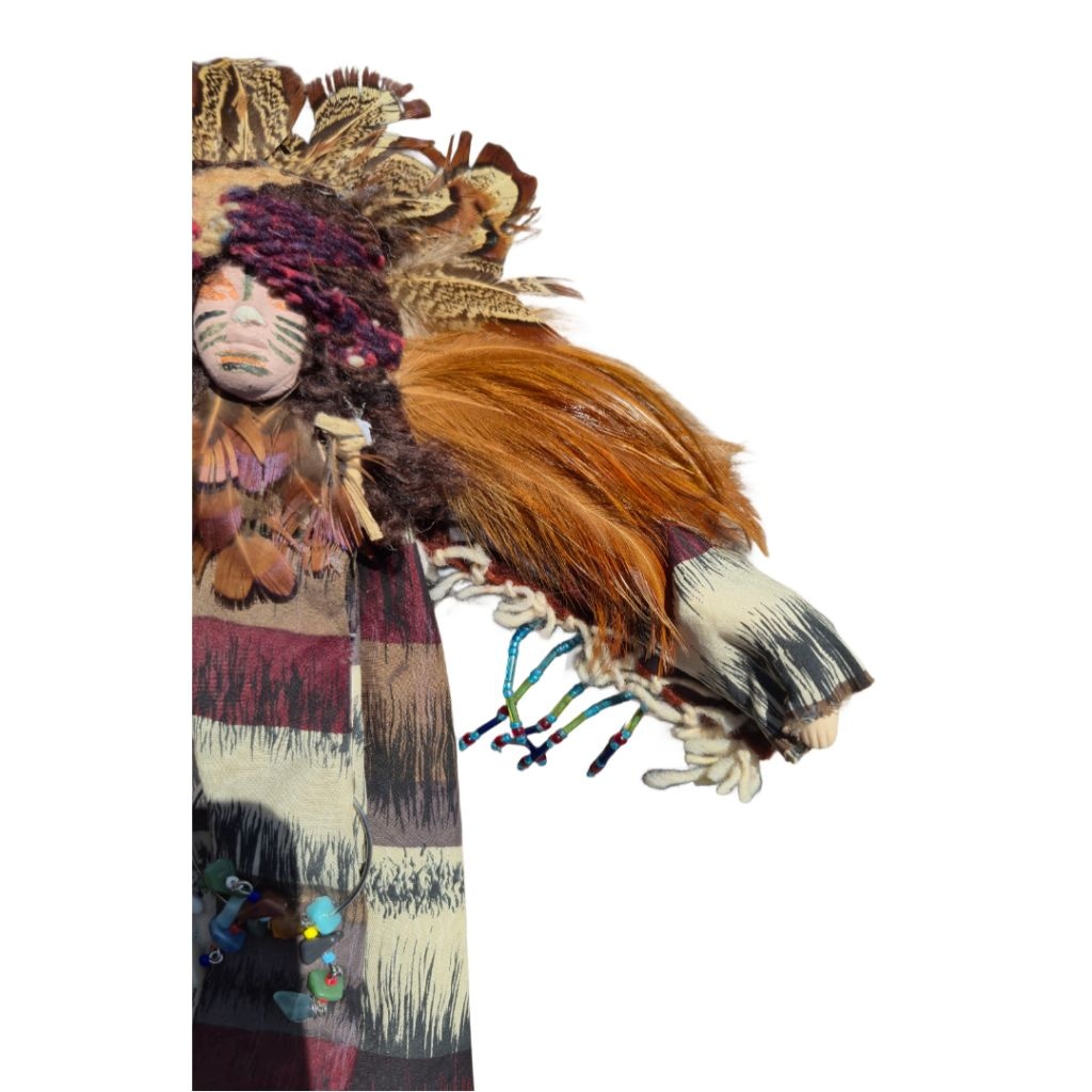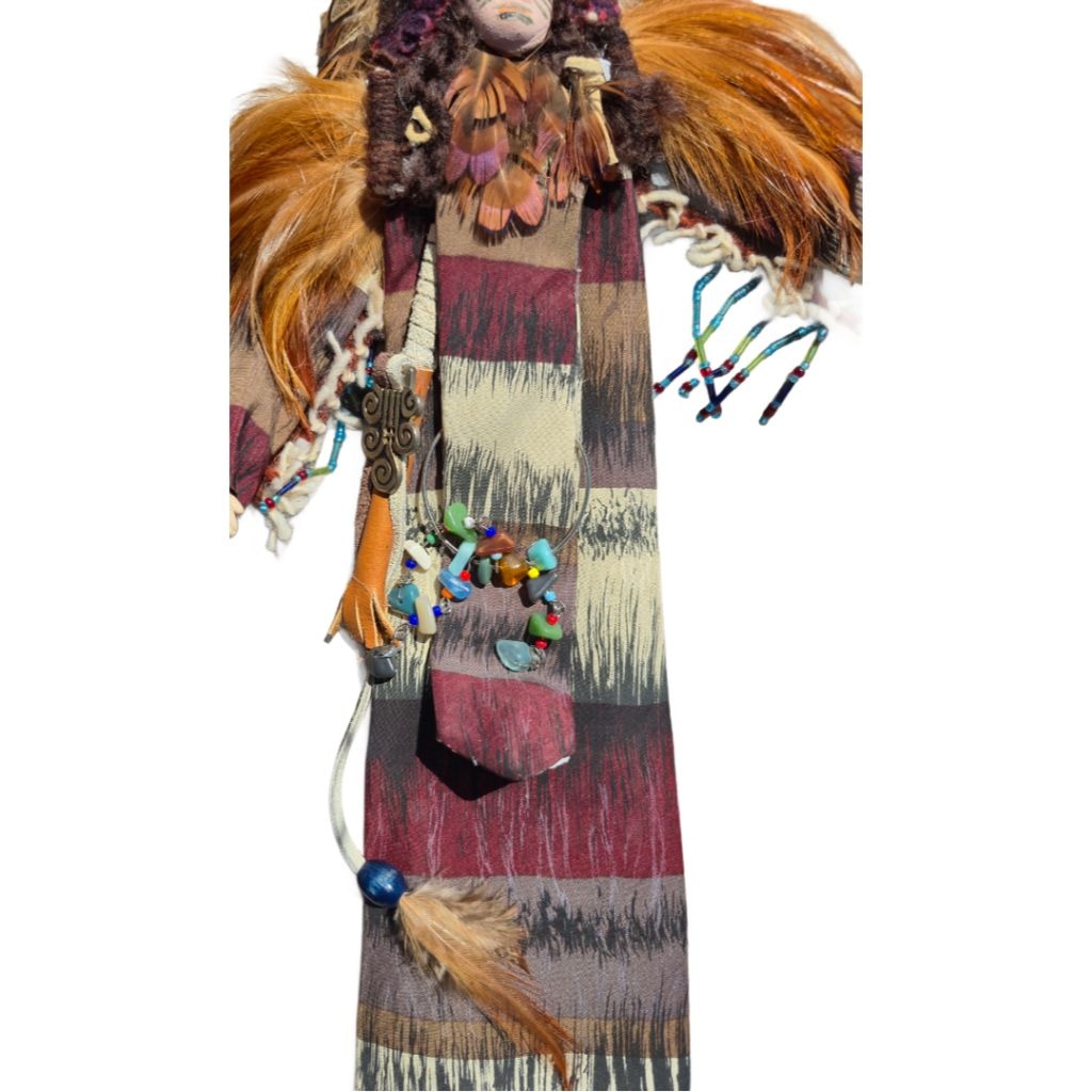 Bring soulful artistry and rustic charm to your space with this handcrafted mixed media tribal-inspired spirit doll wall hanging. Designed with intricate woven textiles, natural feathers, beads, and mixed fibers, this unique art piece reflects cultural storytelling, earthy tones, and artisan craftsmanship. Perfect for tribal, bohemian, Southwestern, or eclectic home décor, each detail — from the hand-shaped face to the fringe accents — evokes a sense of spiritual connection and individuality.