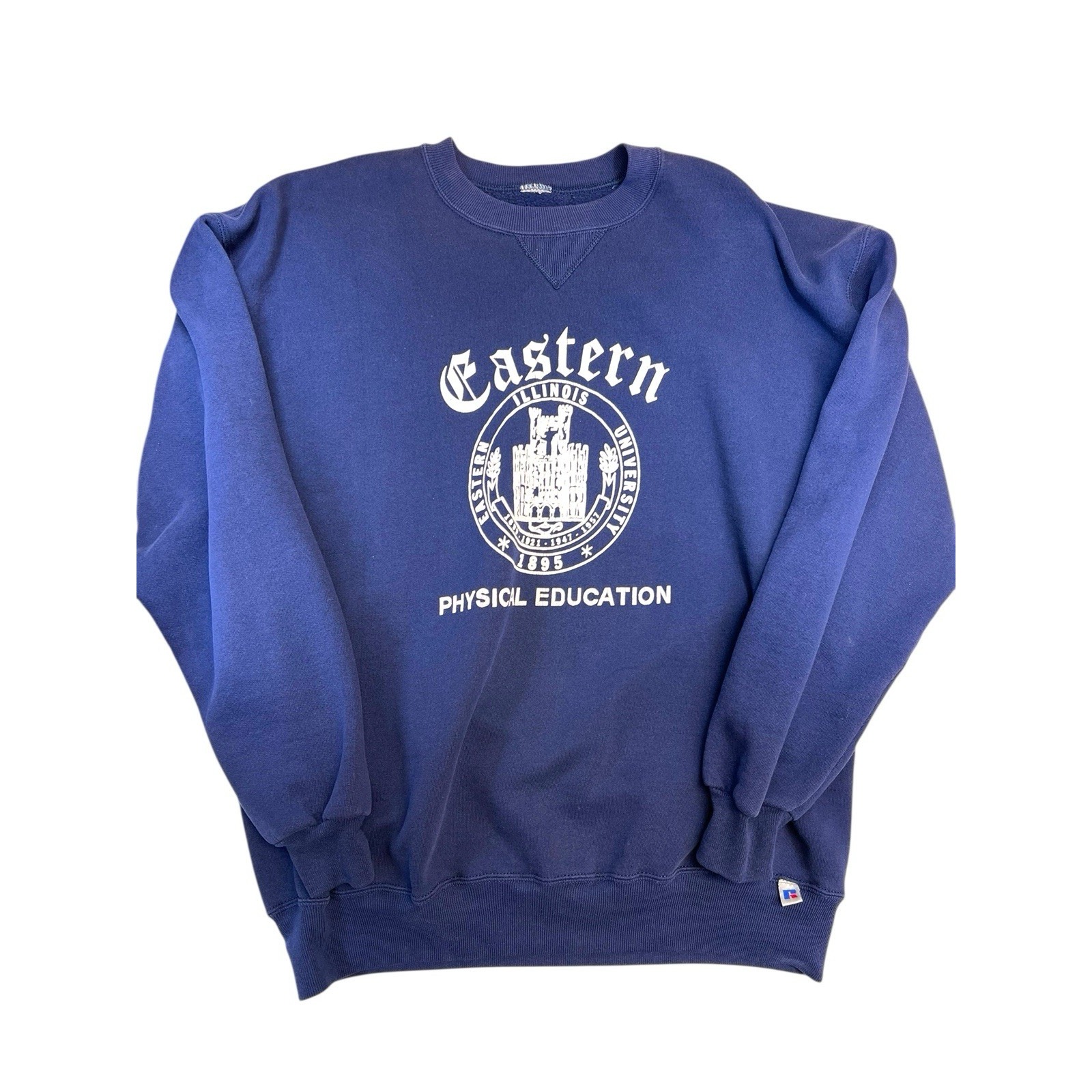 This Vintage Russell College Sweatshirt in navy blue is a classic piece perfect for any retro or hip hop enthusiast. Made of heavyweight cotton, this pullover sweatshirt features a solid design with a crew neck and long sleeves. Perfect for all seasons, this XL sized sweatshirt is machine washable and ideal for activities such as gym training, tennis, and running. The blue color and American college theme make it a timeless addition to any wardrobe, representing a piece of USA's college history.
