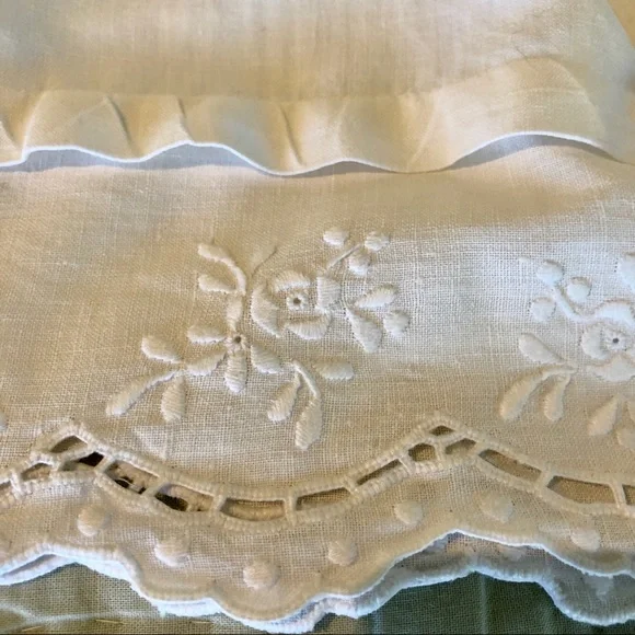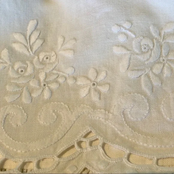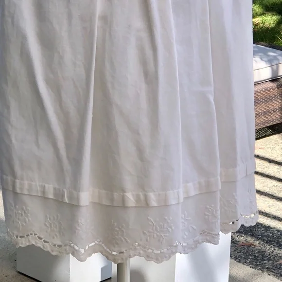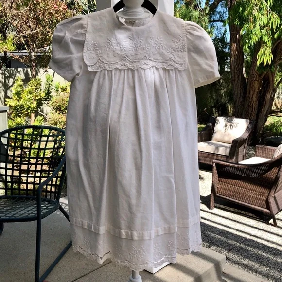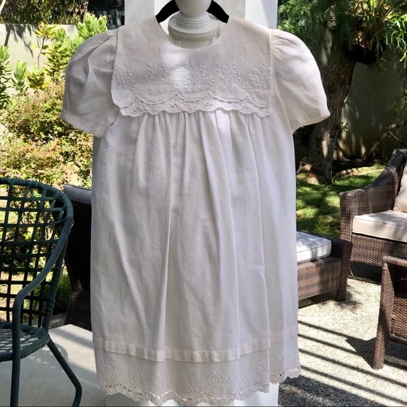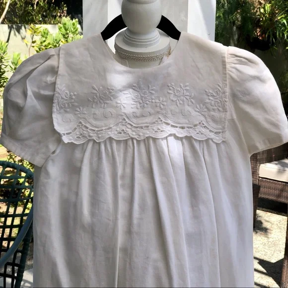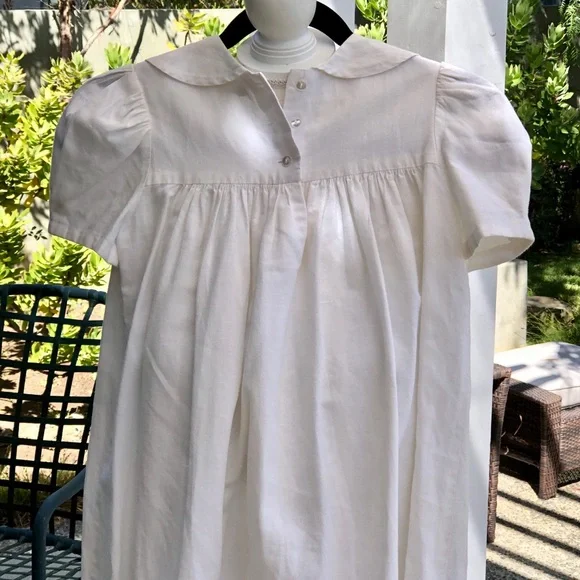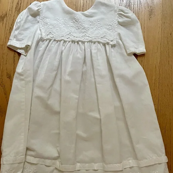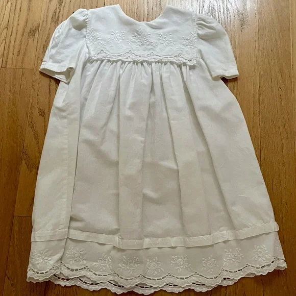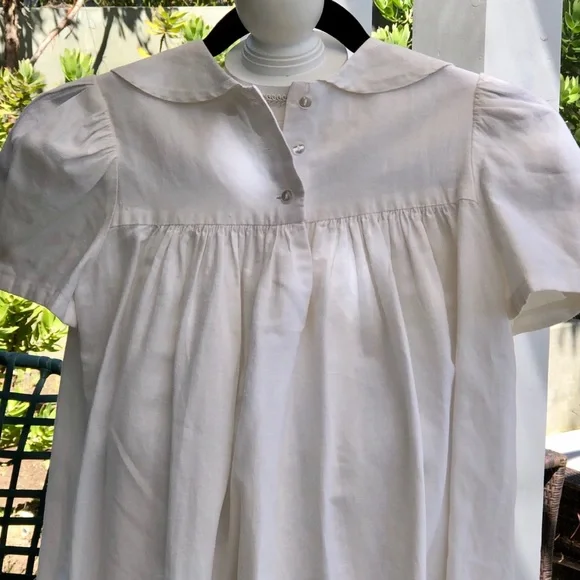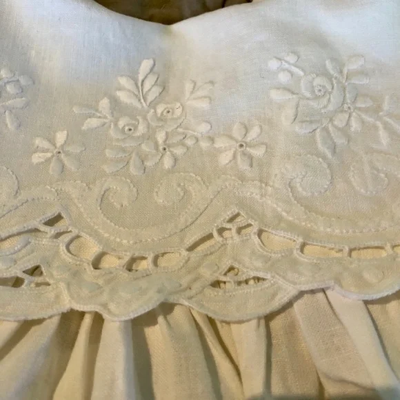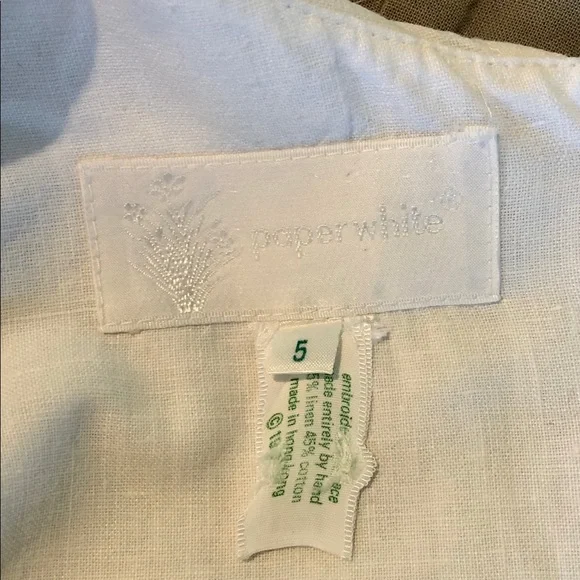 Vintage "Paper White"Linen and Cotton Girls DressSize 5Classic White Summer DressEmbroidered eyelet lace trim at bottom and bib collarThis was the dress that the flower girl wore at my wedding.30" down the front30" down the back17" across front underarm to underarm55% linen45% cottonLovely vintage conditionTwo tiny marks very faint on the back of the dressSee photos